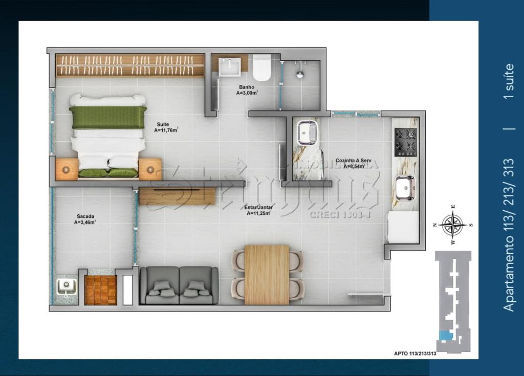 Apartamento contendo 1 dormitório, sala/cozinha, área de serviço, banheiro, 1 vaga de garagem.
