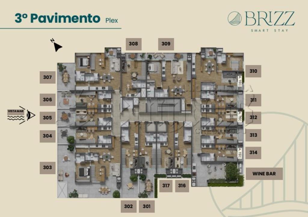 Áreas comuns e lazer: Rooftop com piscina aquecida, deck contemplativo com vista para o mar, salão de festas com skybar e churrasqueira, espaço kids, academia (espaço fitness), coworking, lavanderia compartilhada OMO, Wine Bar no 3º pavimento, Mini Market Housi, lockers e hall de entrada decorado.